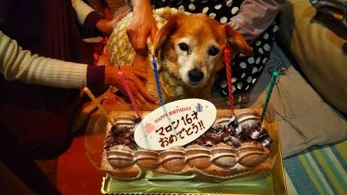 11月11日 ポッキーの日 マロンは16歳の誕生日を迎えることが出来ました。 夕方に姪達の家族や友人がお祝いに来てくださいました。ケーキは犬用ではなく皆さんで頂きました。 姪の娘のMちゃん(18歳)からプレゼントされた可愛い毛布マロンの小さいころから良く…