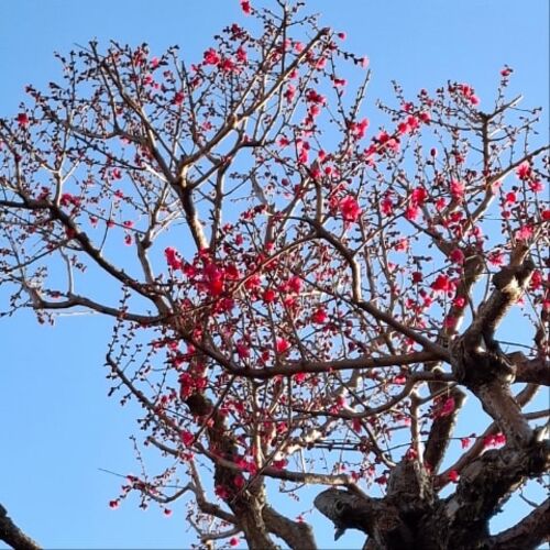 夫の祖父の庭に植えられたこの紅梅は回りまわって我が家の庭に植えられた古い紅梅です。一重の紅梅ですが濃い色合いは青い空に良く映えます。根元には今も福寿草が咲いています。